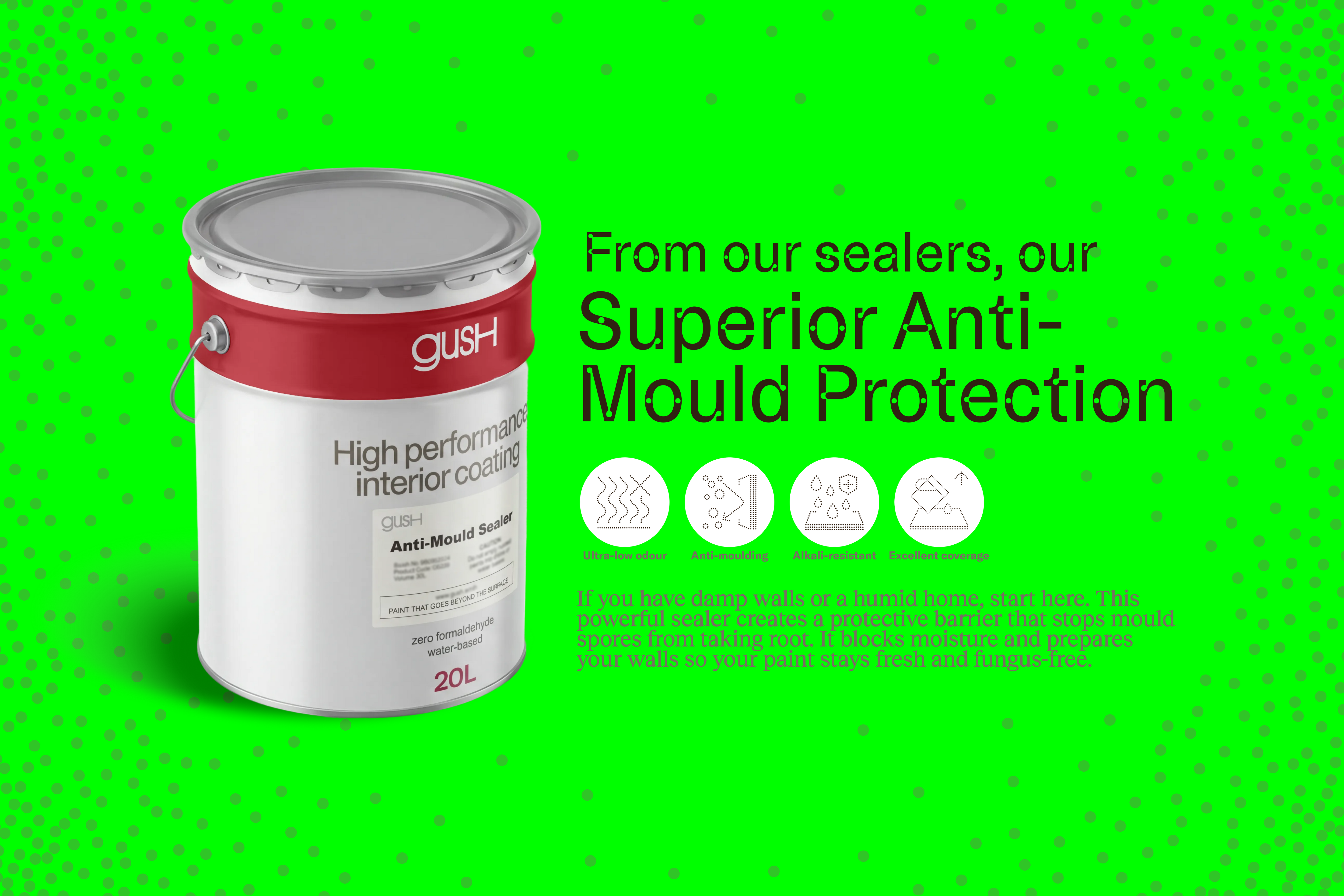 Gush Anti-Mould Sealer is a premium water-based acrylic sealer designed to provide superior mould resistance, creating a durable barrier that protects walls from moisture infiltration. It is specially formulated to resist alkali attacks, ensuring long-lasting protection for topcoat finishes.